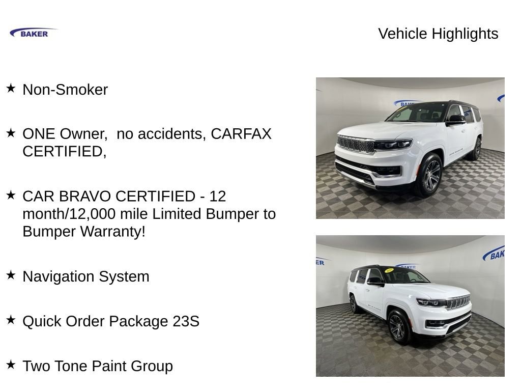 Bright White Clearcoat 2023 Jeep Grand Wagoneer 4WD 8-Speed Automatic 6.4L V8 Non-Smoker, ONE Owner, no accidents, CARFAX CERTIFIED,, CAR BRAVO CERTIFIED - 12 month/12,000 mile Limited Bumper to Bumper Warranty!, 4D Sport Utility, 6.4L V8, 4WD, Bright White Clearcoat, Black Leather, Navigation System, Quick Order Package 23S, Two Tone Paint Group.