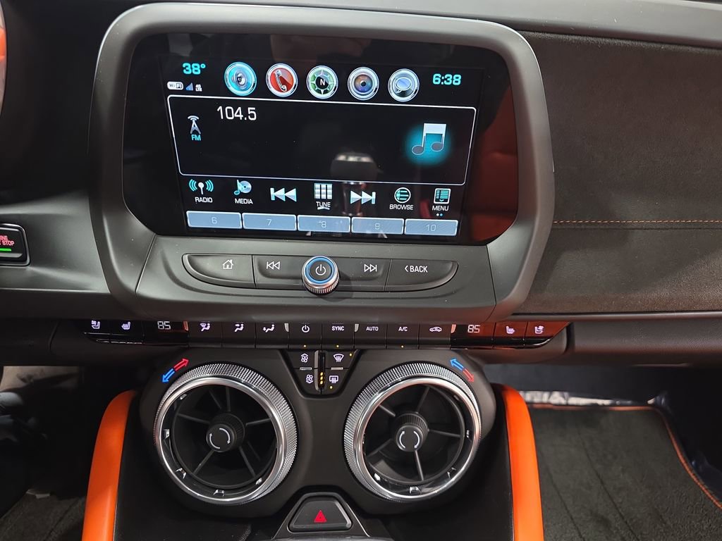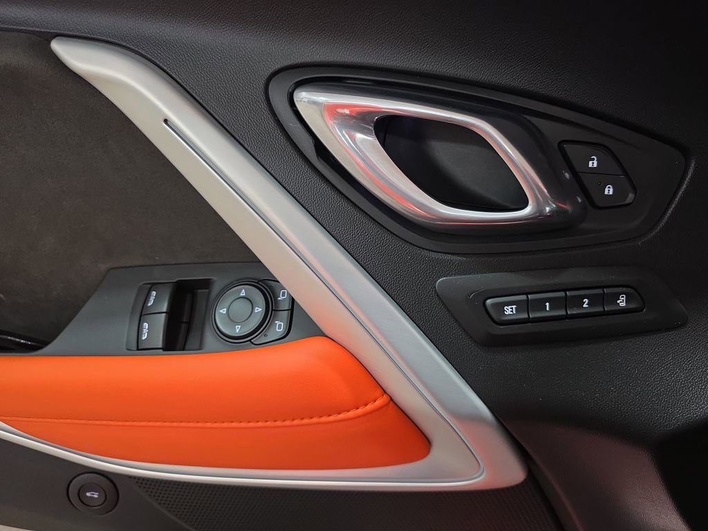 The interior of this Camaro is equally impressive, featuring Jet Black front leather-trimmed seats with Orange inserts and accent stitching, a sueded microfiber-wrapped flat-bottom steering wheel, and a host of advanced technology features. The Bose premium audio system, Chevrolet MyLink infotainment system, and Apple CarPlay/Android Auto integration ensure you'll enjoy every drive.