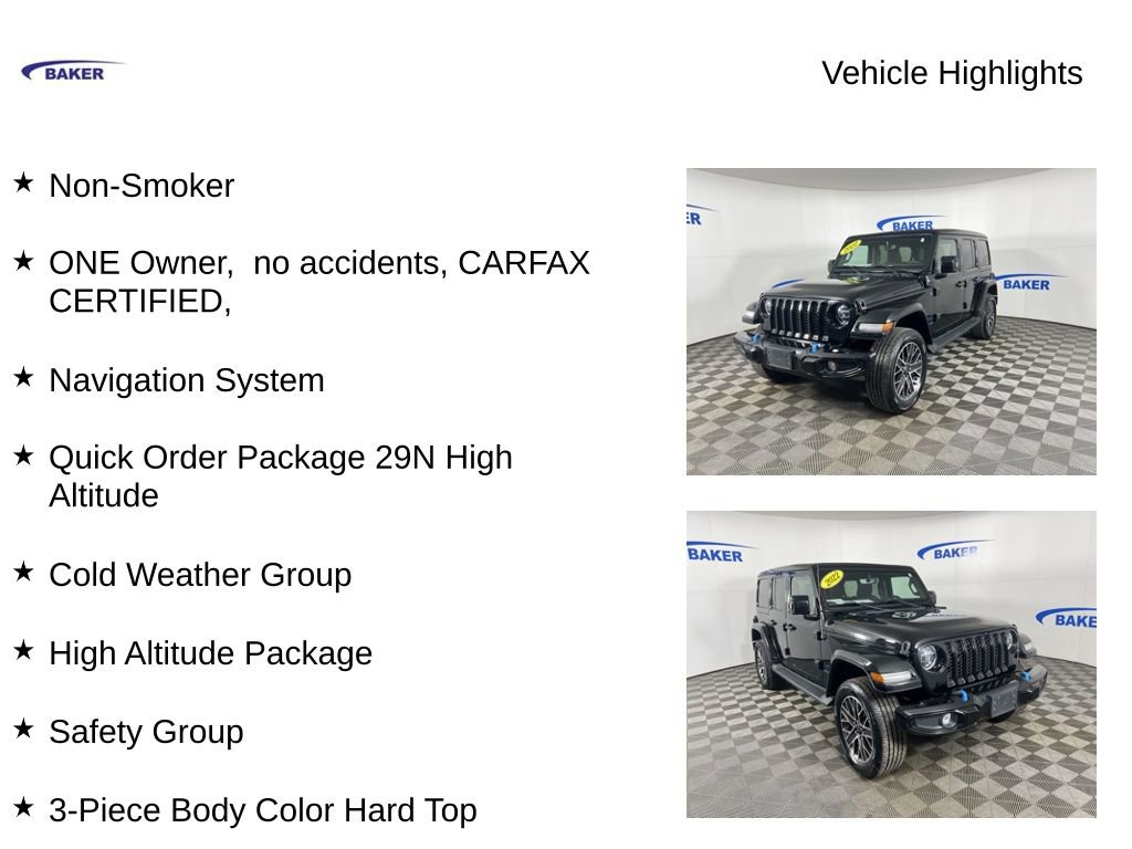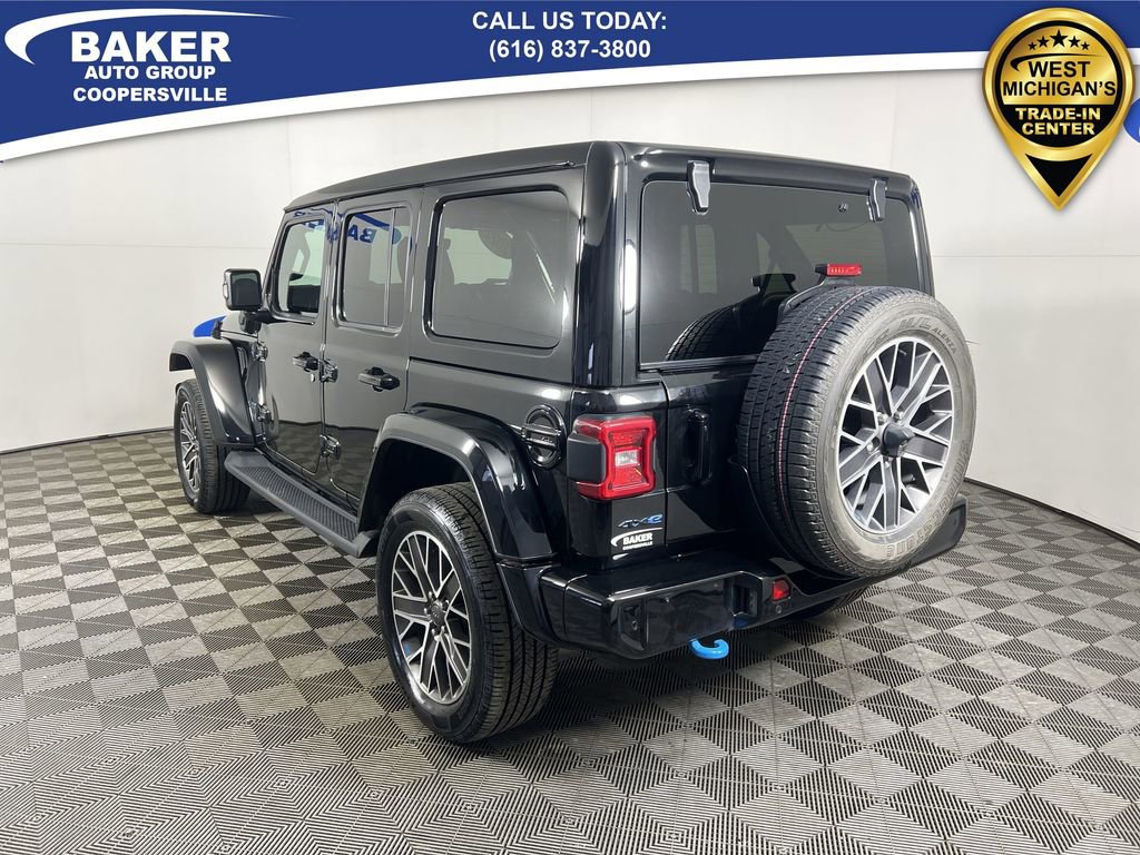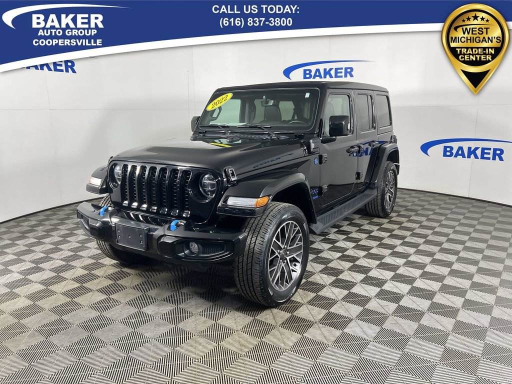 New Price! Black Clearcoat 2022 Jeep Wrangler Unlimited Sahara High Altitude 4xe 4WD 8-Speed Automatic 2.0L I4 DOHC Non-Smoker, ONE Owner, no accidents, CARFAX CERTIFIED,, Wrangler Unlimited Sahara High Altitude 4xe, 4D Sport Utility, 2.0L I4 DOHC, 4WD, Black Clearcoat, Black Leather, 3-Piece Body Color Hard Top, Body Color Door Handles, Body Color Front Bumper, Body Color Grille w/Gloss Black Rings, Body Color Power Locking Fuel Filler Door, Body Color Rear Bumper w/Step Pads, Cold Weather Group, Exterior Mirrors w/Supplemental Signals, Heated Front Seats, Heated Steering Wheel, High Altitude Package, Leather Trimmed Bucket Seats, Navigation System, ParkView Rear Back-Up Camera, Premium Dark Exterior Accents, Quick Order Package 29N High Altitude, Remote Start System, Safety Group, Summit Badging, Wheels: 20 x 8.0 Fully Painted Aluminum, Wrapped I/P Bezel w/Caramel Stitch.CALL US TODAY 6168373800.