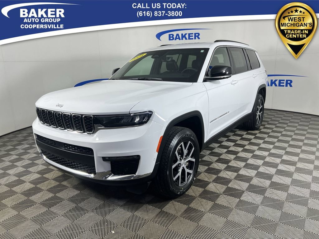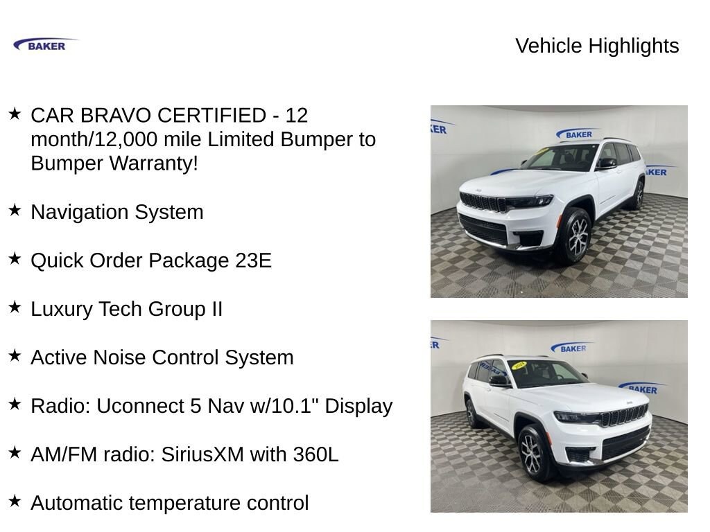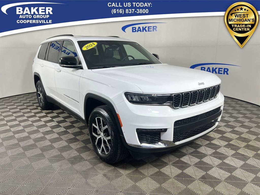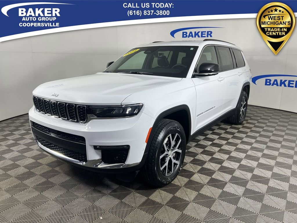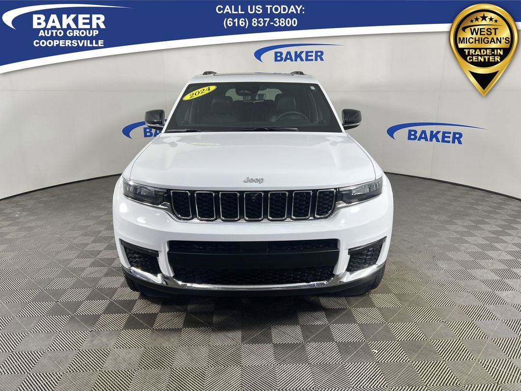 New Price! Bright White Clearcoat 2024 Jeep Grand Cherokee L Limited 4WD 8-Speed Automatic 3.6L V6 24V VVT CAR BRAVO CERTIFIED - 12 month/12,000 mile Limited Bumper to Bumper Warranty!, Grand Cherokee L Limited, 3.6L V6 24V VVT, 4WD, Bright White Clearcoat, 2nd Row Manual Window Shades, Active Noise Control System, AM/FM radio: SiriusXM with 360L, Auto-Dimming Exterior Driver Mirror, Automatic temperature control, Capri Leatherette w/Axis II Seats, Dual-Pane Panoramic Sunroof, Front dual zone A/C, Heated front seats, Heated rear seats, Heated steering wheel, Integrated Off-Road Camera, Interior Rear Facing Camera, Intersection Collision Assist System, Luxury Tech Group II, Memory seat, Memory Steering Column, Navigation System, ParkSense Front/Rear Park Assist w/Stop, ParkView Rear Back-Up Camera, Passive Entry - Front/Rear Doors, Liftgate, Power driver seat, Power Liftgate, Power passenger seat, Quick Order Package 23E, Radio: Uconnect 5 Nav w/10.1 Display, Rain Sensitive Windshield Wipers, Rear Back Up Camera Washer, Rearview Autodim Digital Display Mirror, Surround View Camera System, Ventilated Front Seats, Wheels: 18 x 8.0 Polished/Painted Aluminum, Wireless Charging Pad.